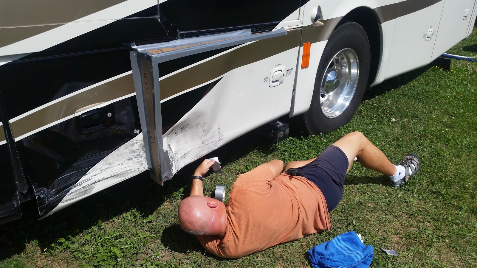 The crash occurred on July 23rd just prior to us arriving at the Escapees National Rally in Essex Junction, VT. When we arrived at the complex I took a closer look at the damages and contacted Progressive Insurance Company online at 12:49 PM. My biggest concern at this point was that the damage to the "wet bay" door would not allow me to open that door. Because of this, we wouldn't be able to hook up any water or have our tanks drained during our stay. Not a good start to the Escapade.